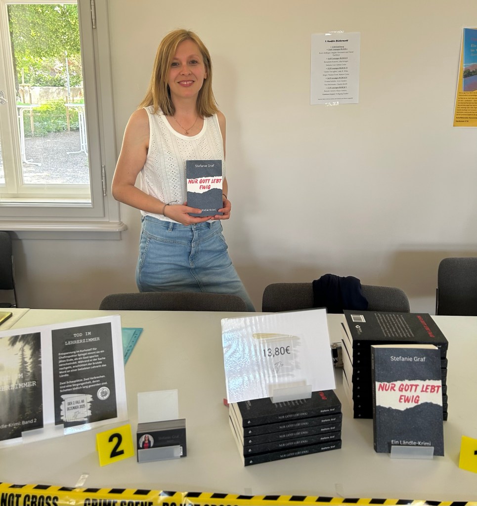 31.05.2025: Mein Ländle-Krimi und ich waren heute beim zweiten Rankler Büchermarkt vertreten. Bei strahlendem Sonnenschein durfte ich nicht nur aus “Nur Gott lebt ewig” vorlesen und einige Exemplare verkaufen, ich habe auch sehr herzliche Gleichgesinnte kennengelernt!