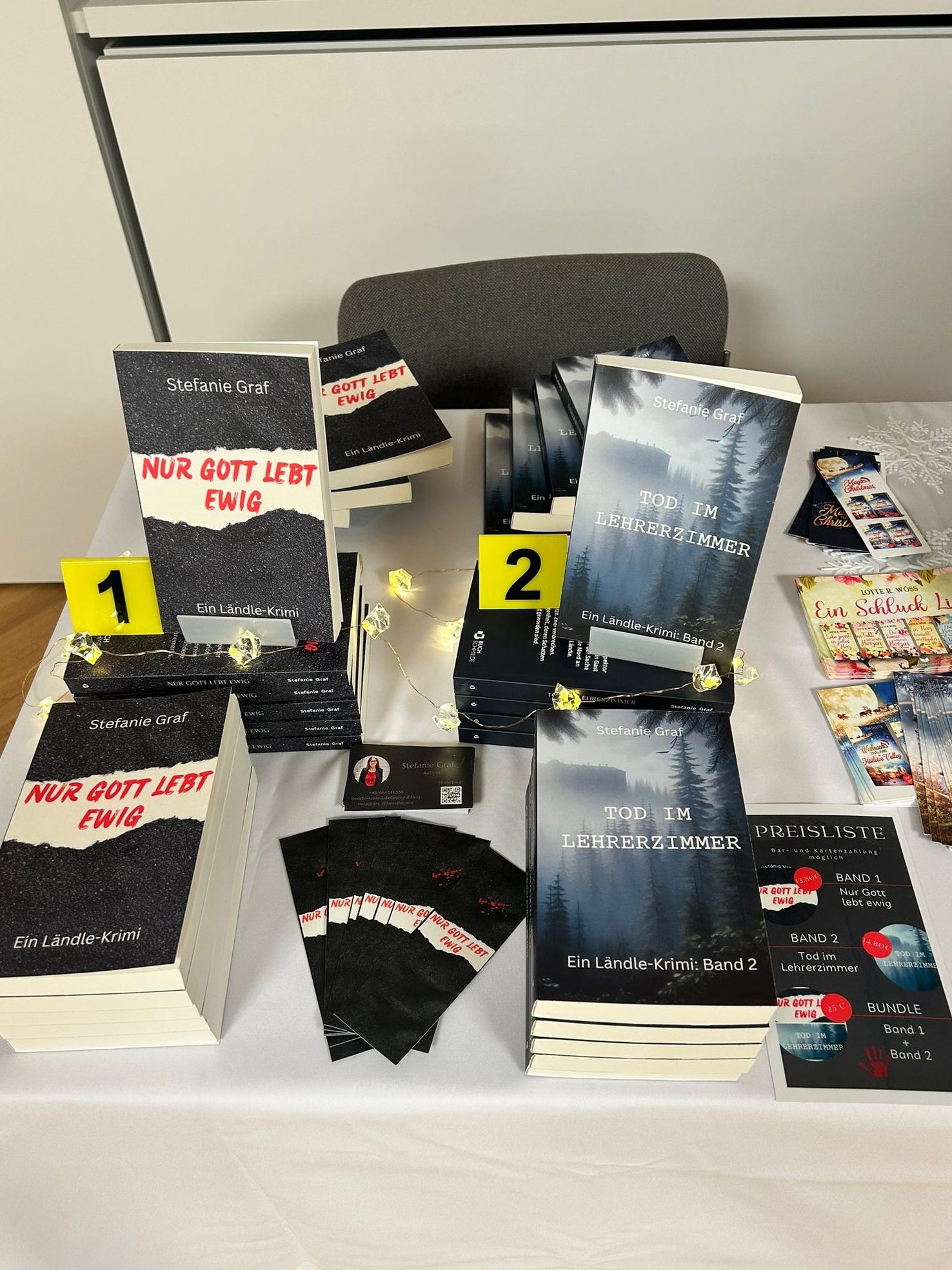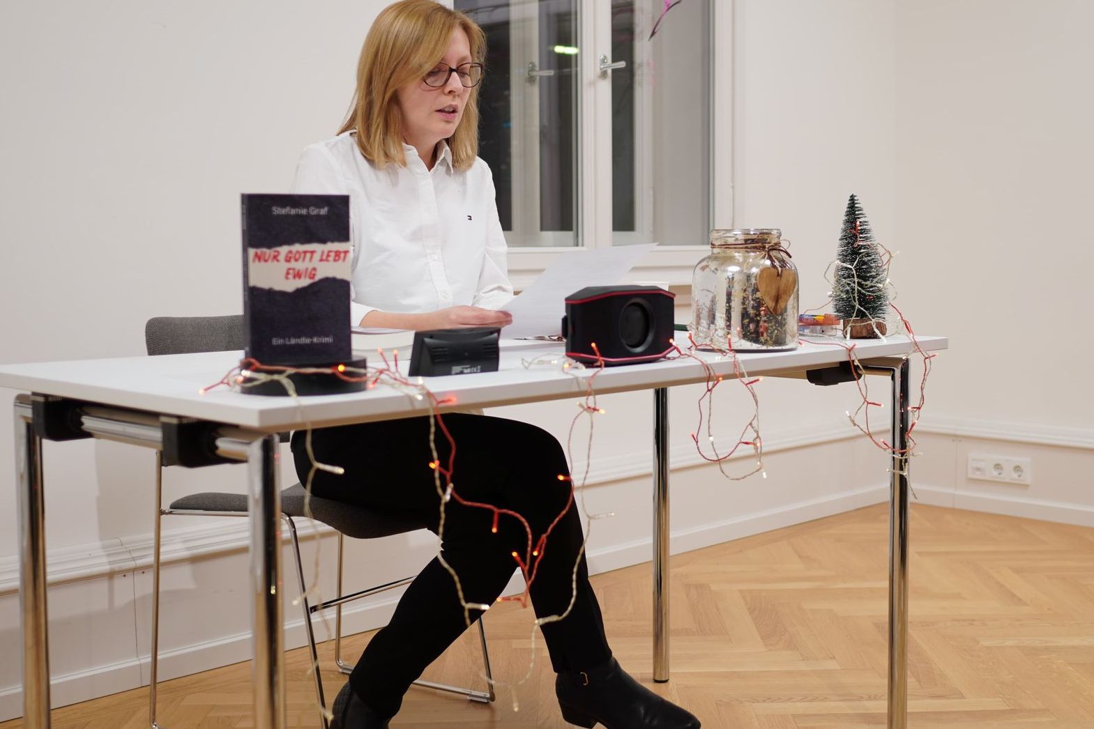 29.11.2025: Gestern hatte ich das Vergnügen, mit drei weiteren Vorarlberger Autorinnen an einer Lesung mitzuwirken! Bei Lebkuchen und weihnachtlicher Musik durfte ich zunächst von meinen Anfängen als Schriftstellerin erzählen und anschließend aus Band 1 und 2 vorlesen. Die abschließenden Gespräche mit Besuchern und Besucherinnen rundeten den Abend perfekt ab.